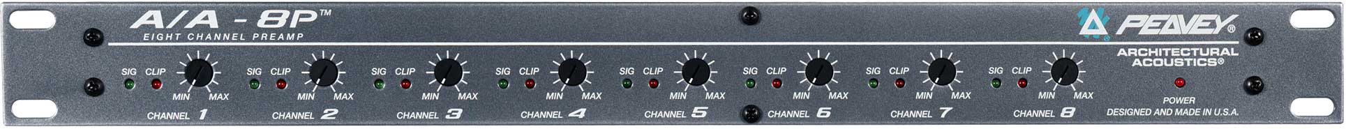 PEAVEY 的产品系列中的 AA-8P 是一款高品质的八路平衡输入前置放大器。每一路提供了一个 电平 控制用以选择线路或麦克风信号输入信号。 AA-8P 前面板提供了非常直观小型的 LED 信号指示灯。在内部每个信号通道都带有一个输入信号限幅器,将***合适的输入信号传递给 MM-8802 数字 接口机 。同样,每个信号通道都带有标准的 48 伏幻象供电。在后面板上有非常方便的选择开关供使用者在限幅和幻象之间切换。在输入和输出是用凤凰头来连接,并可以通过螺丝刀来调节每个输入端的电平。 AA-8P 是标准的 1U 机架式结构。
